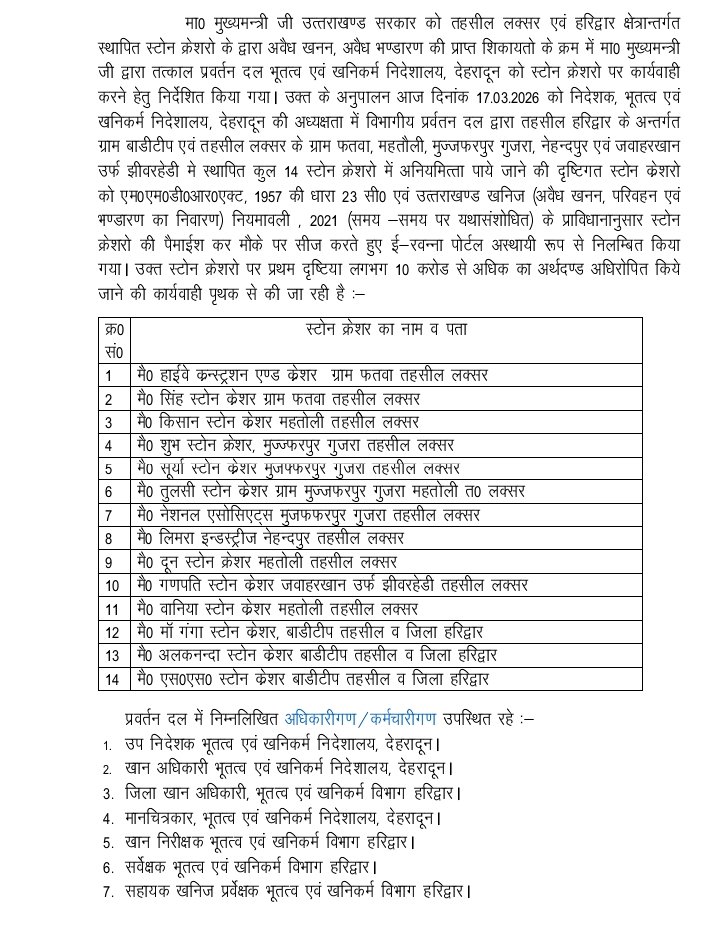 खनन माफियाओं पर कड़ा प्रहार: हरिद्वार-लक्सर में 14 स्टोन क्रेशरों पर बड़ी कार्रवाई